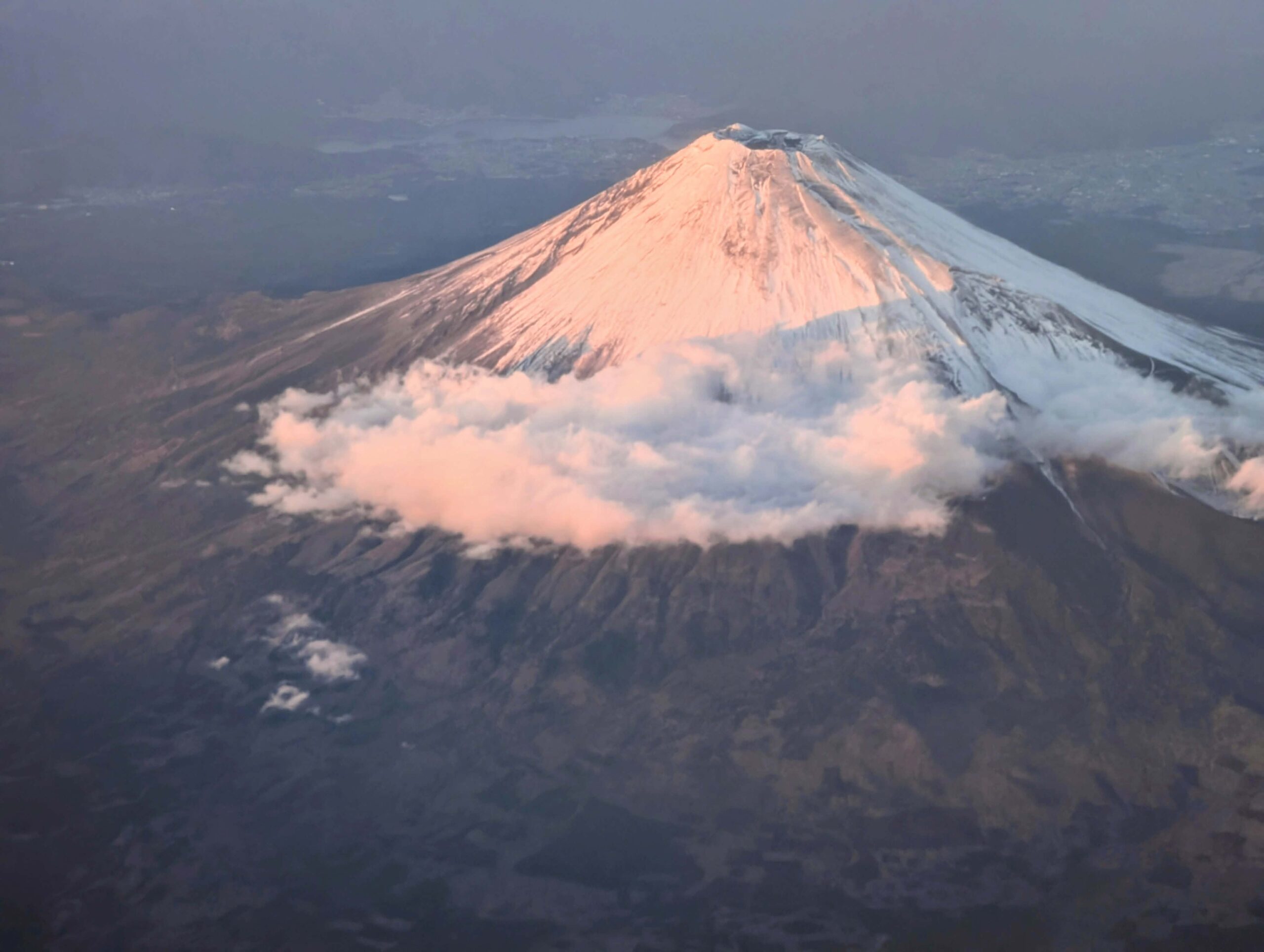 「赤富士というのは夏から秋の早朝や夕暮れに、雪のない富士山の山肌が朝日や夕日に照らされて赤く染まる自然現象」 とのことですが、、、。 昨夕の飛行機からの眺めでは紅葉しているようなところも多く、山肌が赤茶けていて、まさに赤富士と感じました。![]()